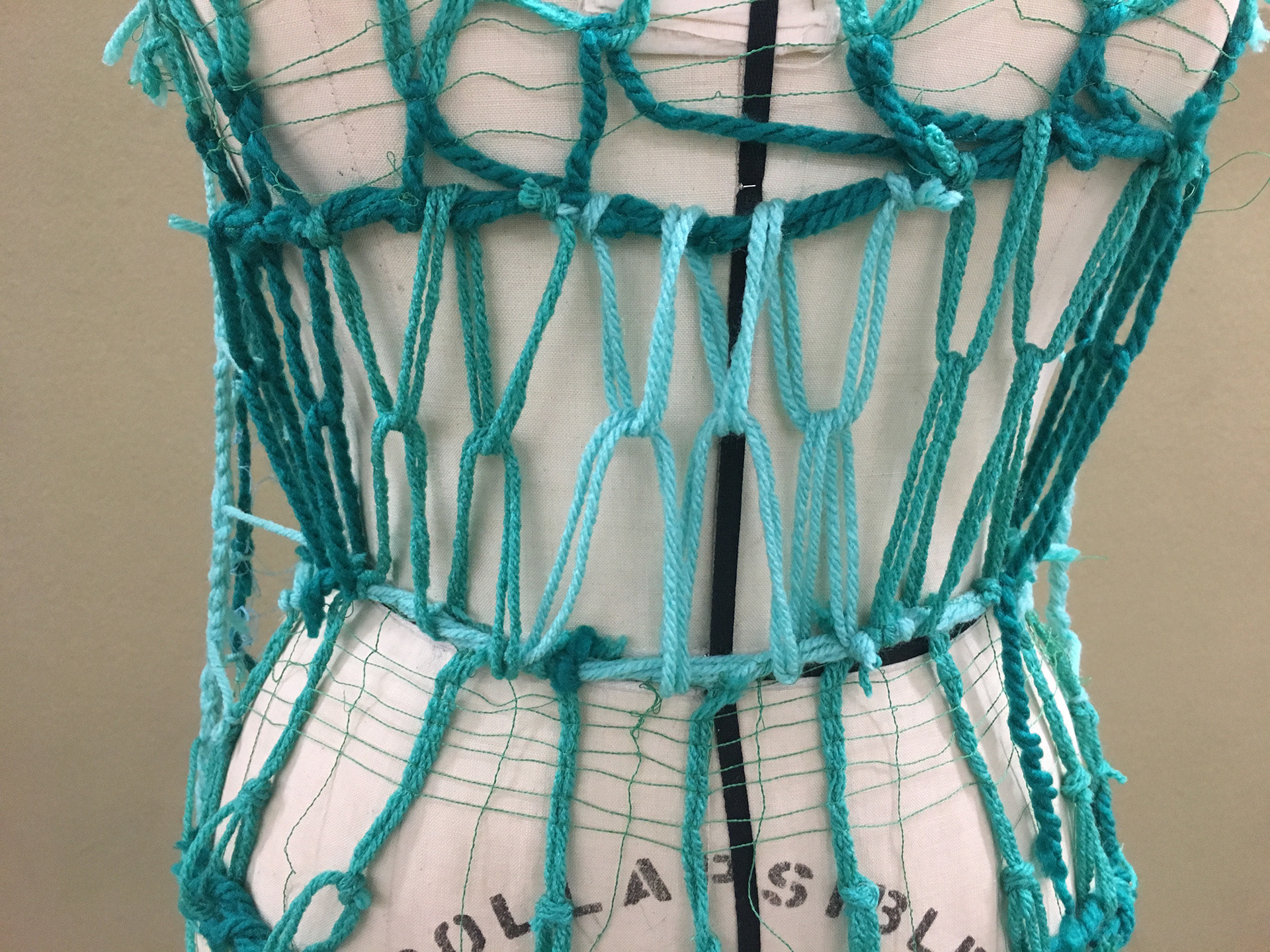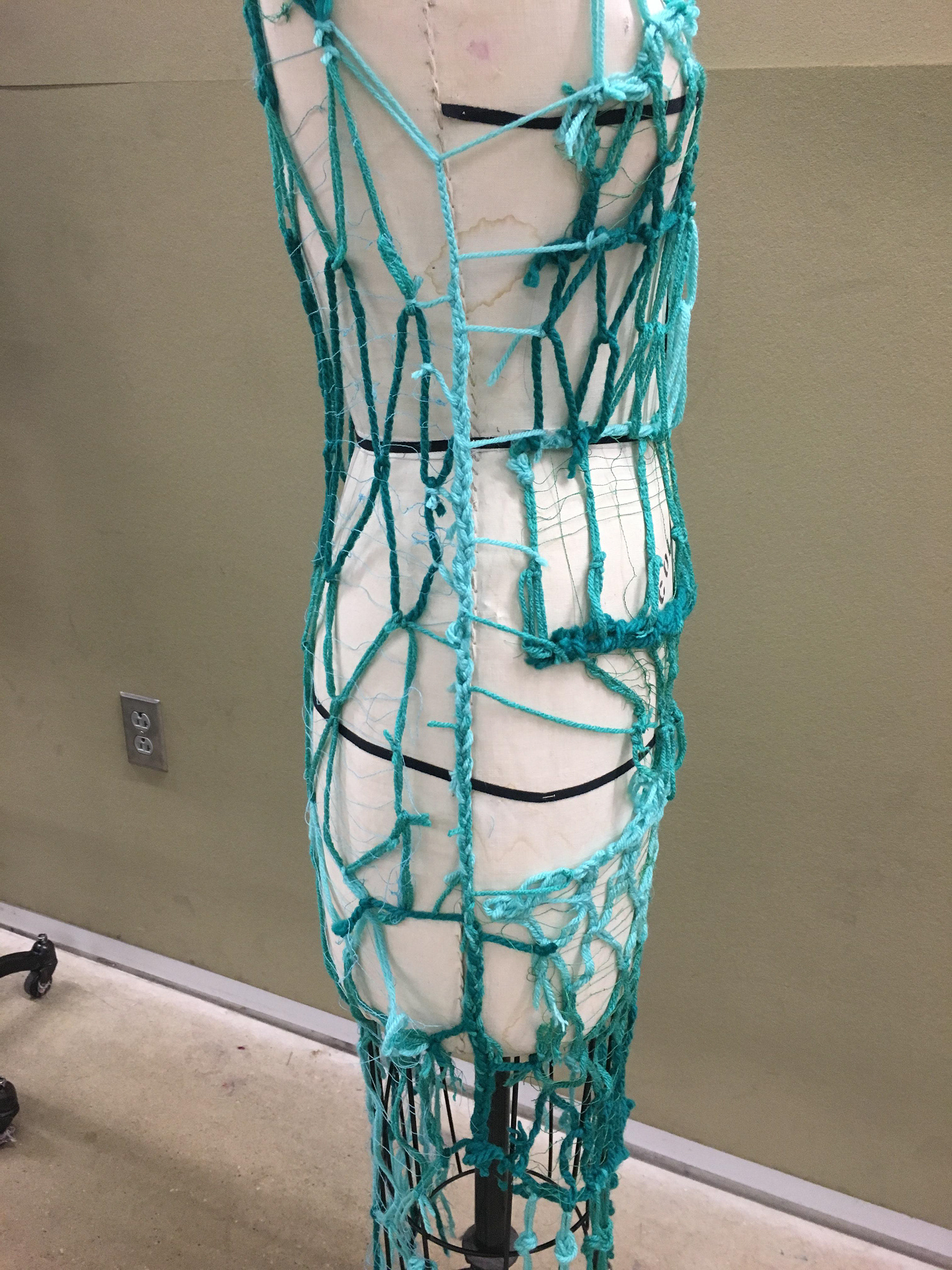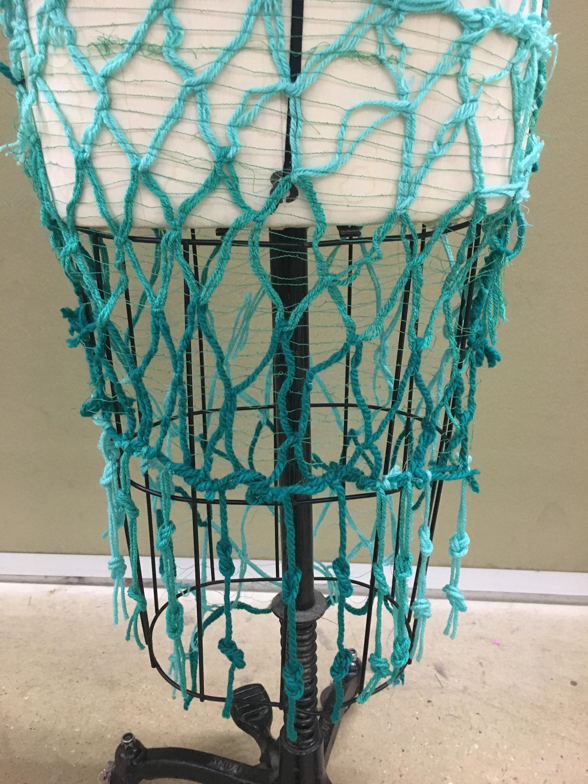 Dress made from yarn and thread using dissolvable interfacing and sailing knots