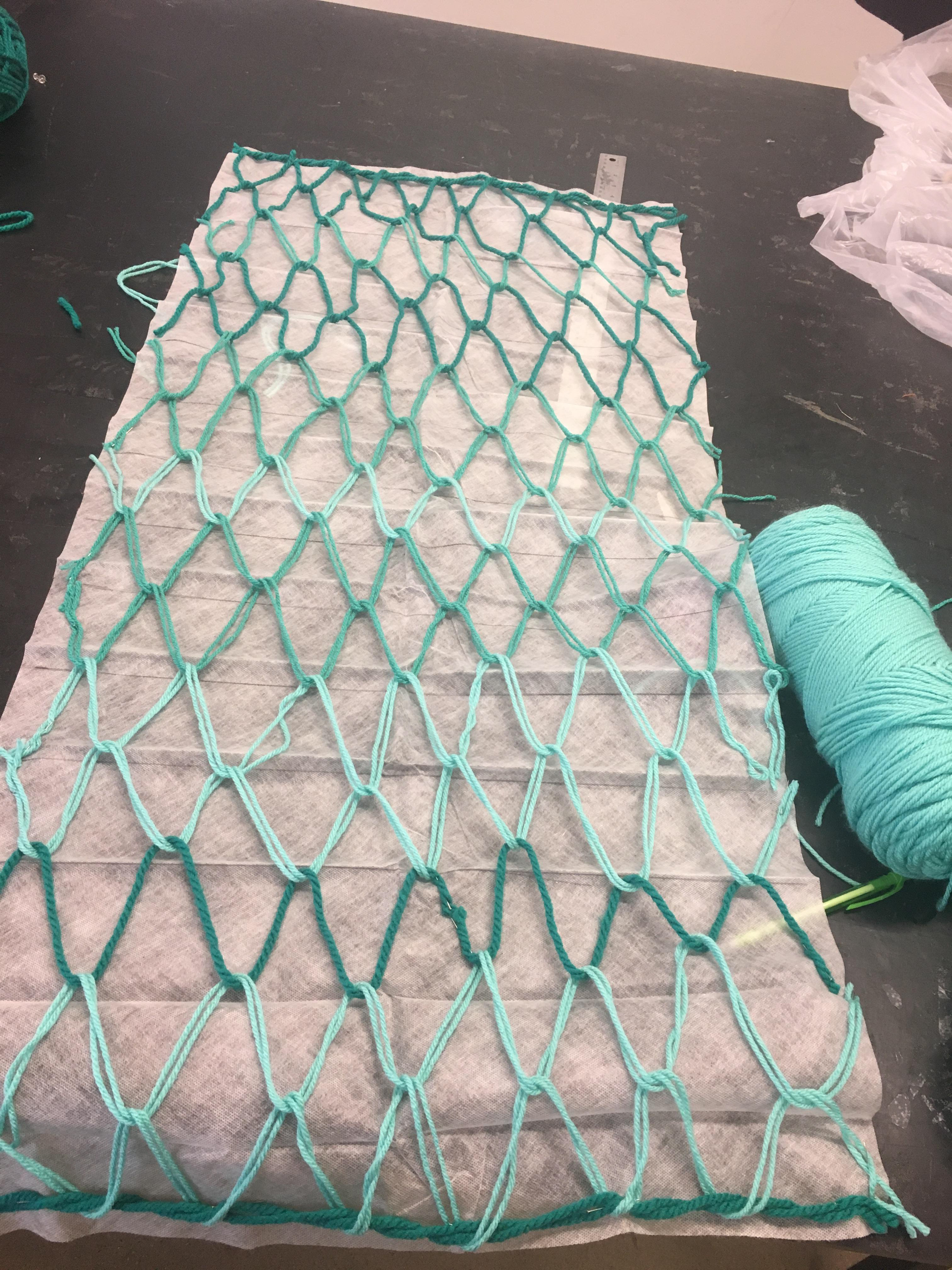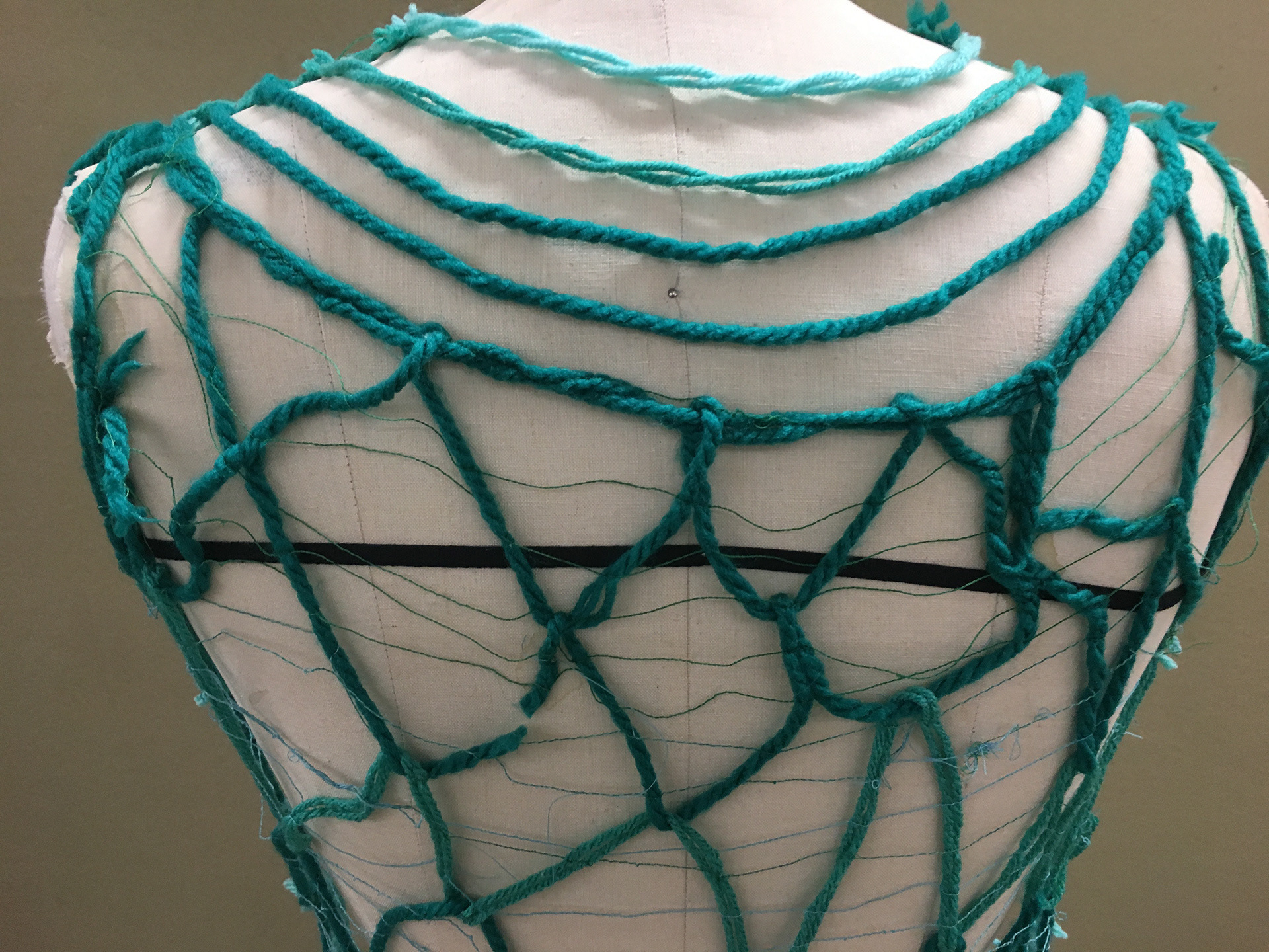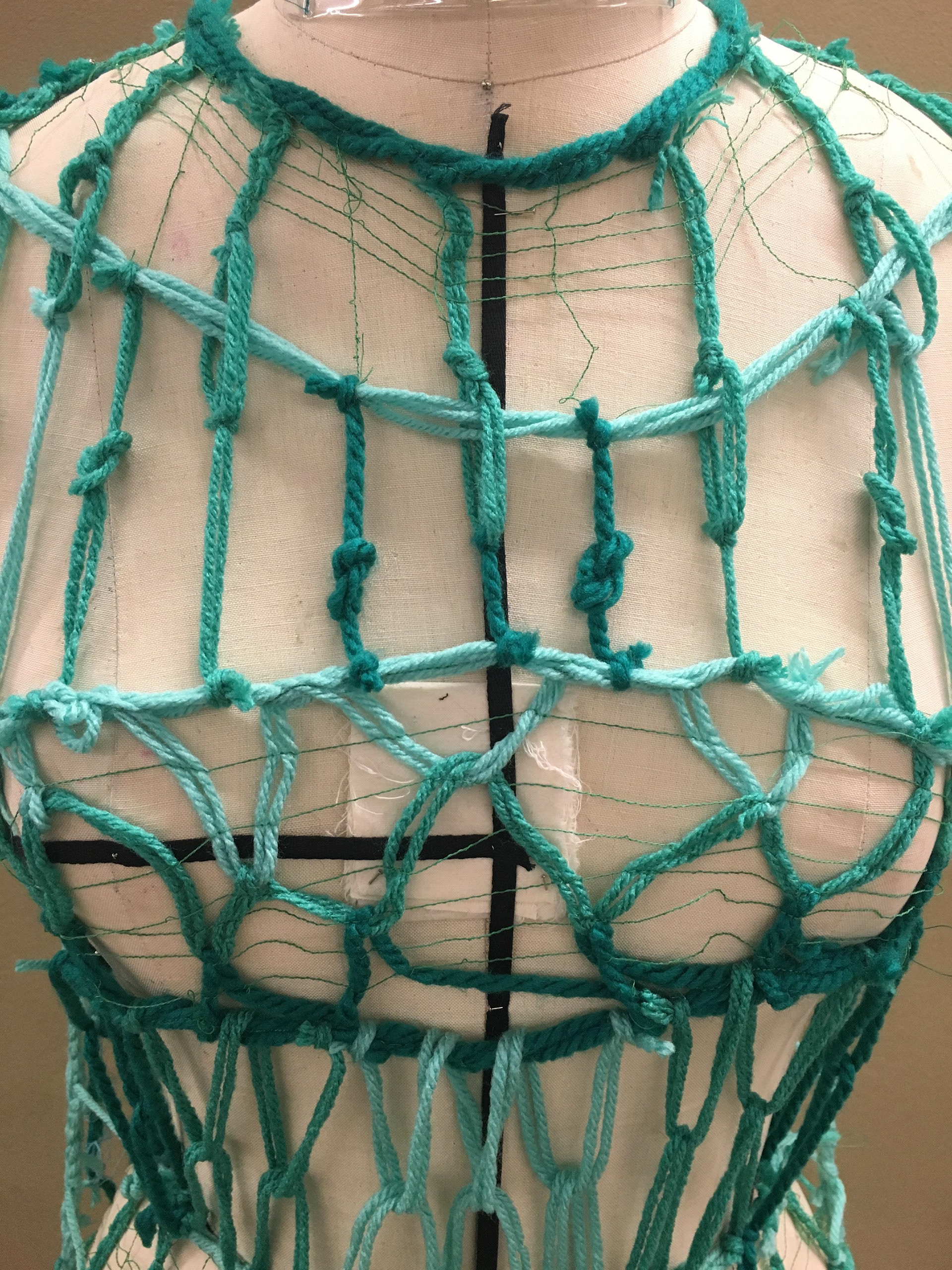 Dress made from yarn and thread using dissolvable interfacing and sailing knots